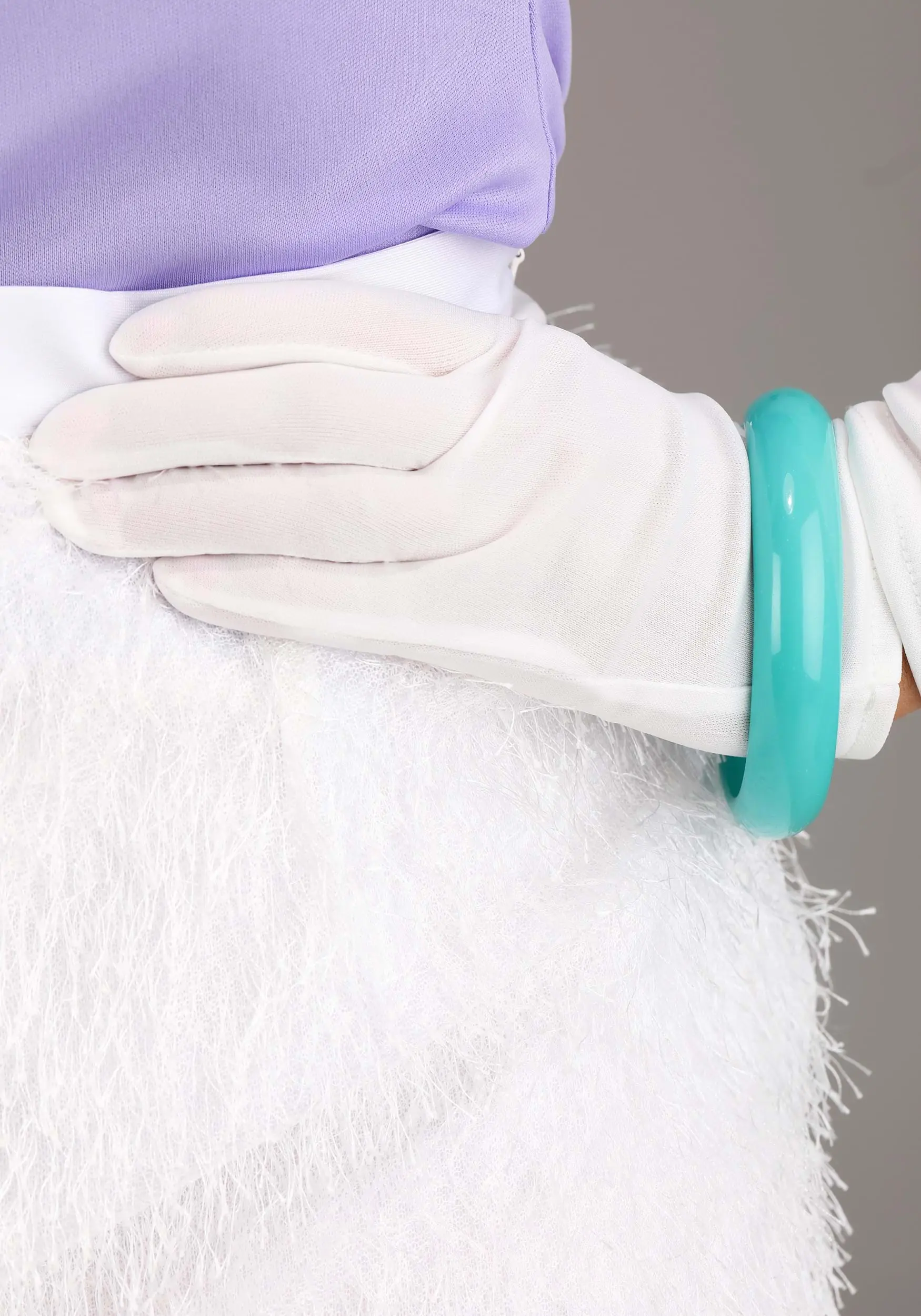- Jersey knit white skirt lining w/ eyelash faux fur, elastic waistband, tail sewn on the back side