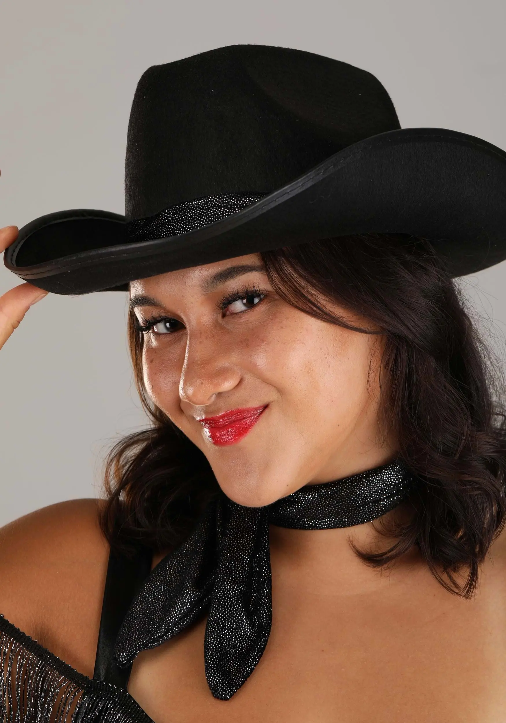 Watch out, Nashville, here comes the next rising star: that’s you, when you wear this Honky Tonk Hottie Costume for Women! The sleeveless black jumpsuit zips up the back and is made of black material that has a shiny faux leather finish. The shoulder straps outline the semi-sweetheart style neckline, which is trimmed in long fringe that wraps around your arms to attach at the shoulder blades to give the costume a cold shoulder appearance. A sparkly black belt with a stylized buckle finishes it off!