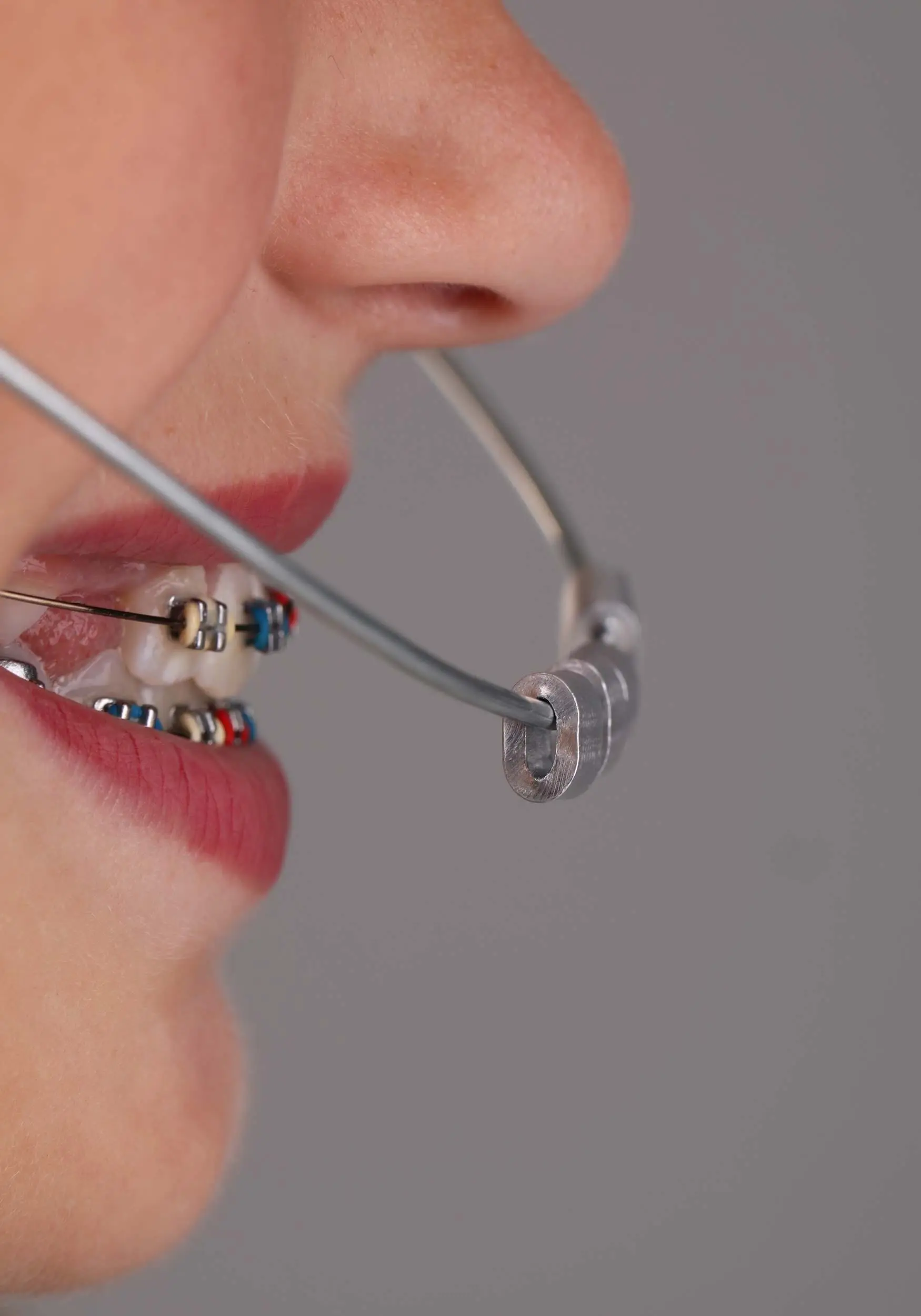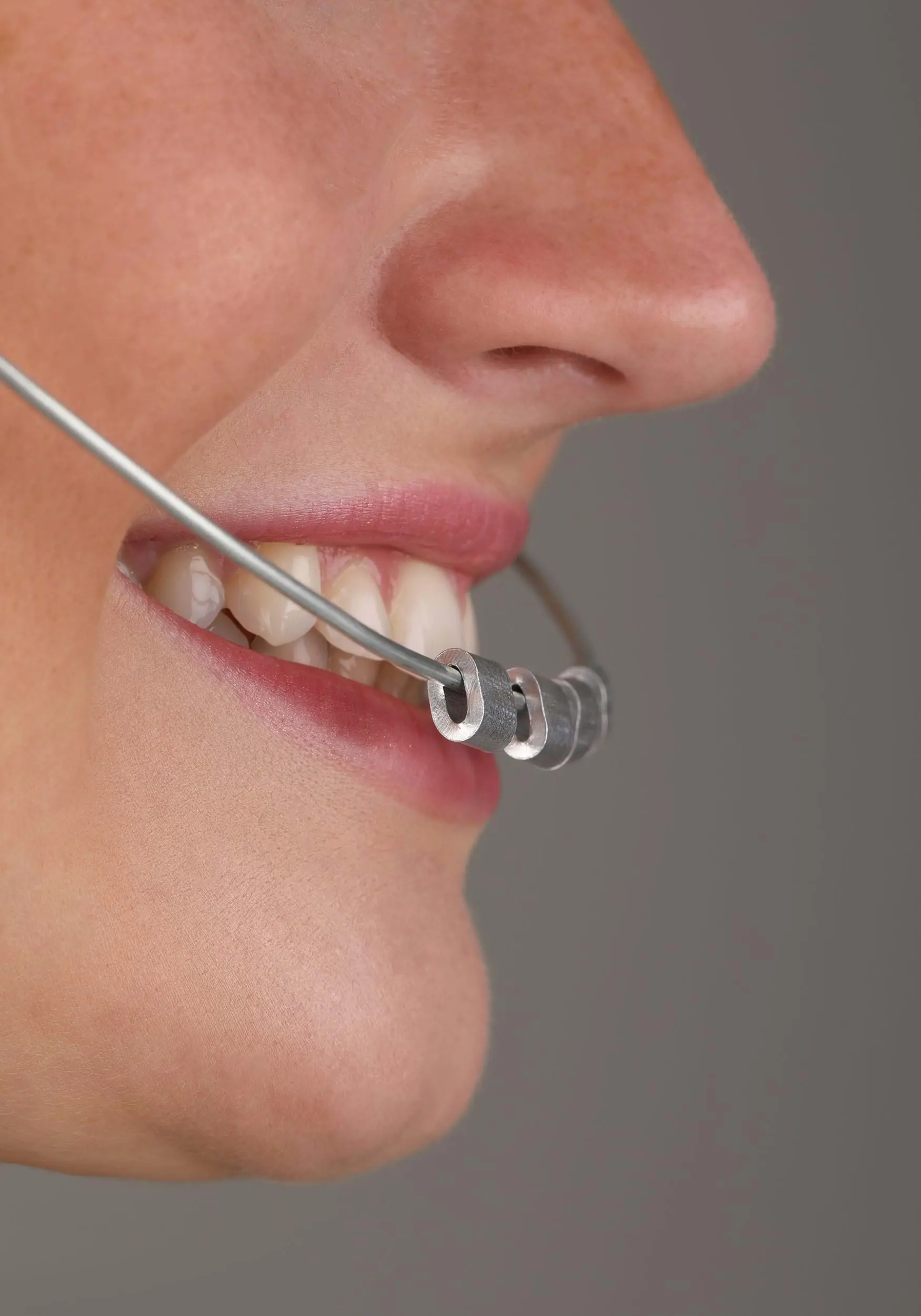 - Headgear is velour-covered plastic headband w/ swiveling wire meant to look like a facebow