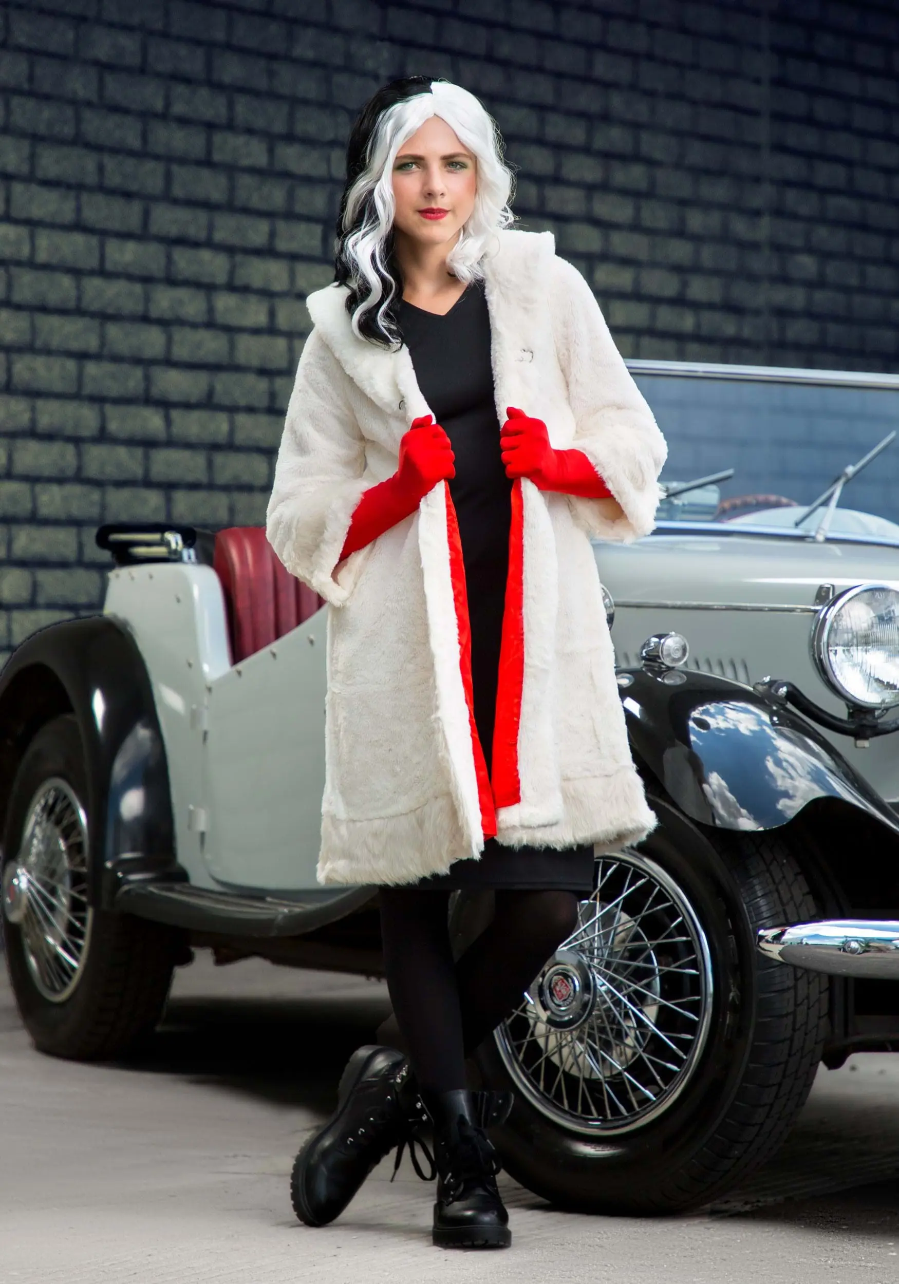 This fully-licensed Disney Villains Cruella De Vil costume from Disney’s 101 Dalmatians is ‘Made By Us,’ which means our fabulous creative team designed this Cruella-inspired look. The faux coat has a realistic texture and a rich red lining along the front and in the cuffs. A chic black dress and long red gloves are also included in this elegant Cruella De Vil costume!