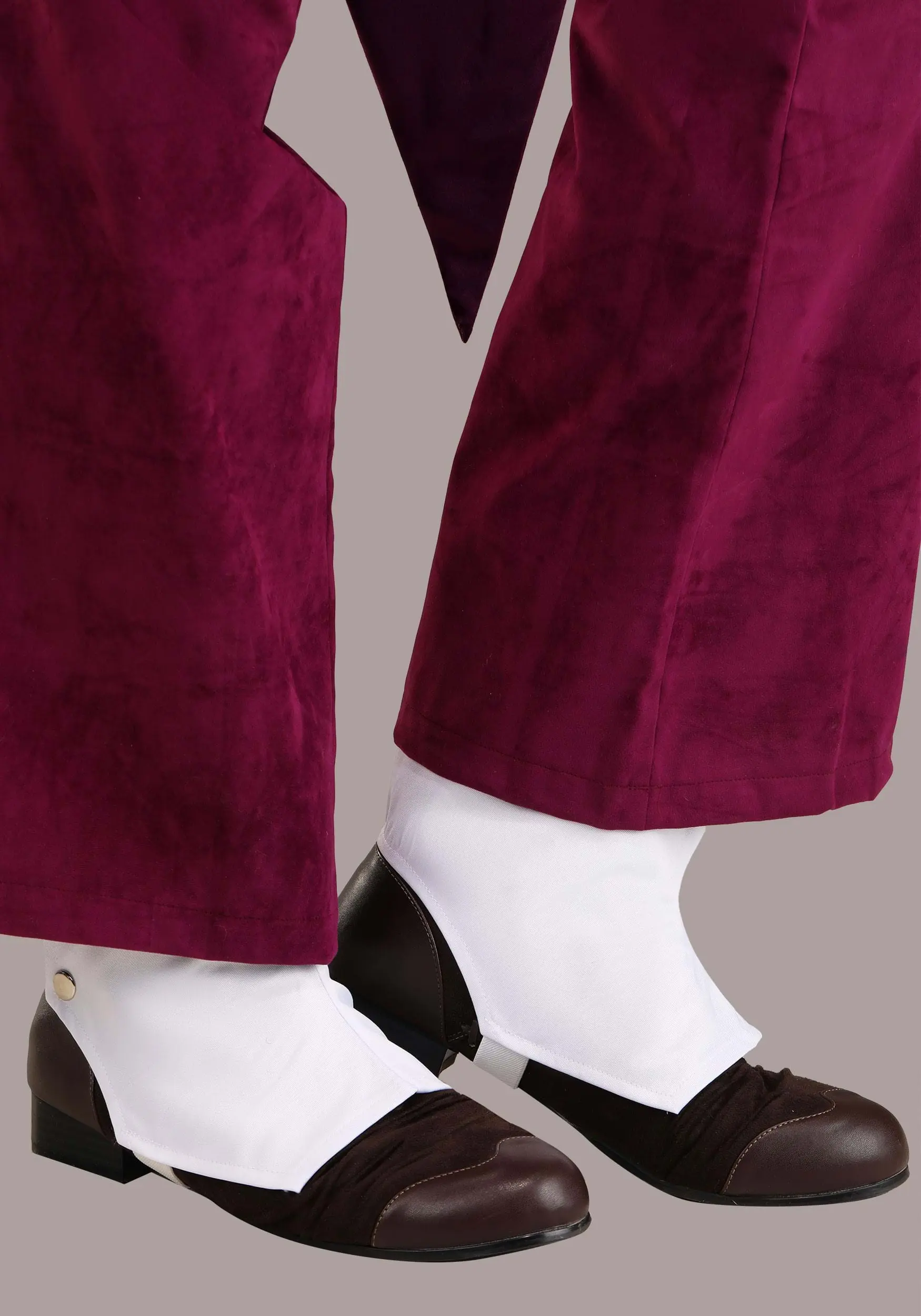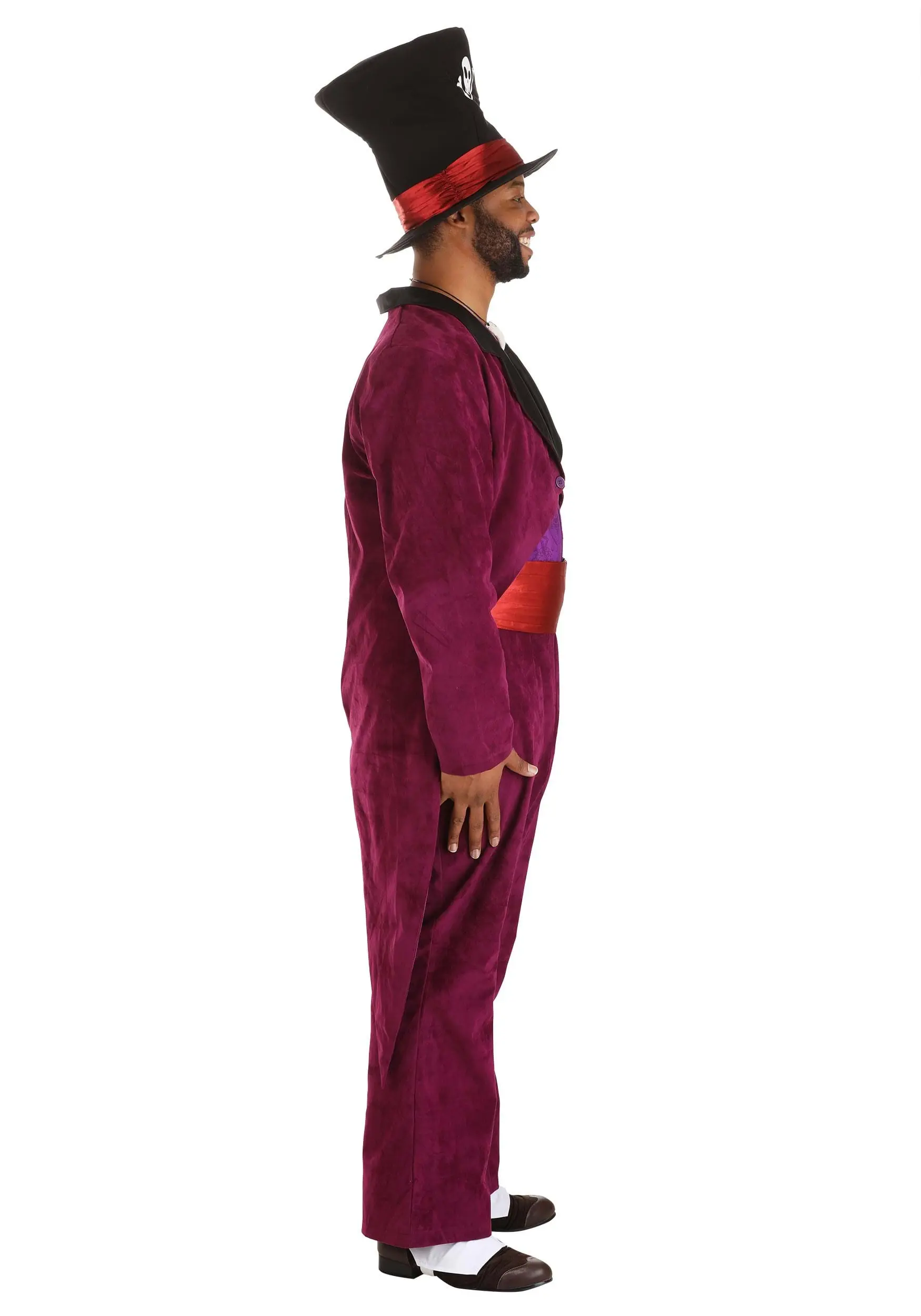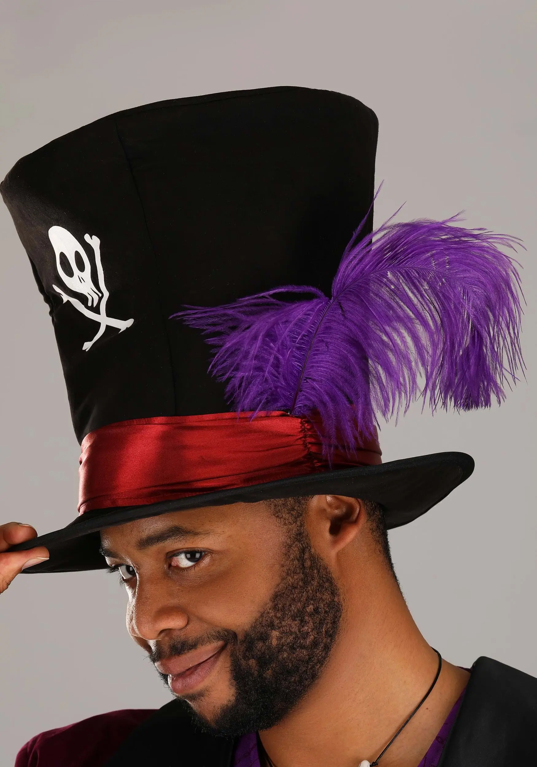 The jacket and pants are made with gorgeous purple velvet, and the vest is a lighter, complementary purple. To add some authentic detail to the costume, we included spats and a bone necklace just like the ones the character wears in the movie. The hat’s finishing touch is complete with feather and red trim that matches the satin cummerbund. We think you’ll feel powerful in this costume, but please be careful about who you make deals with!