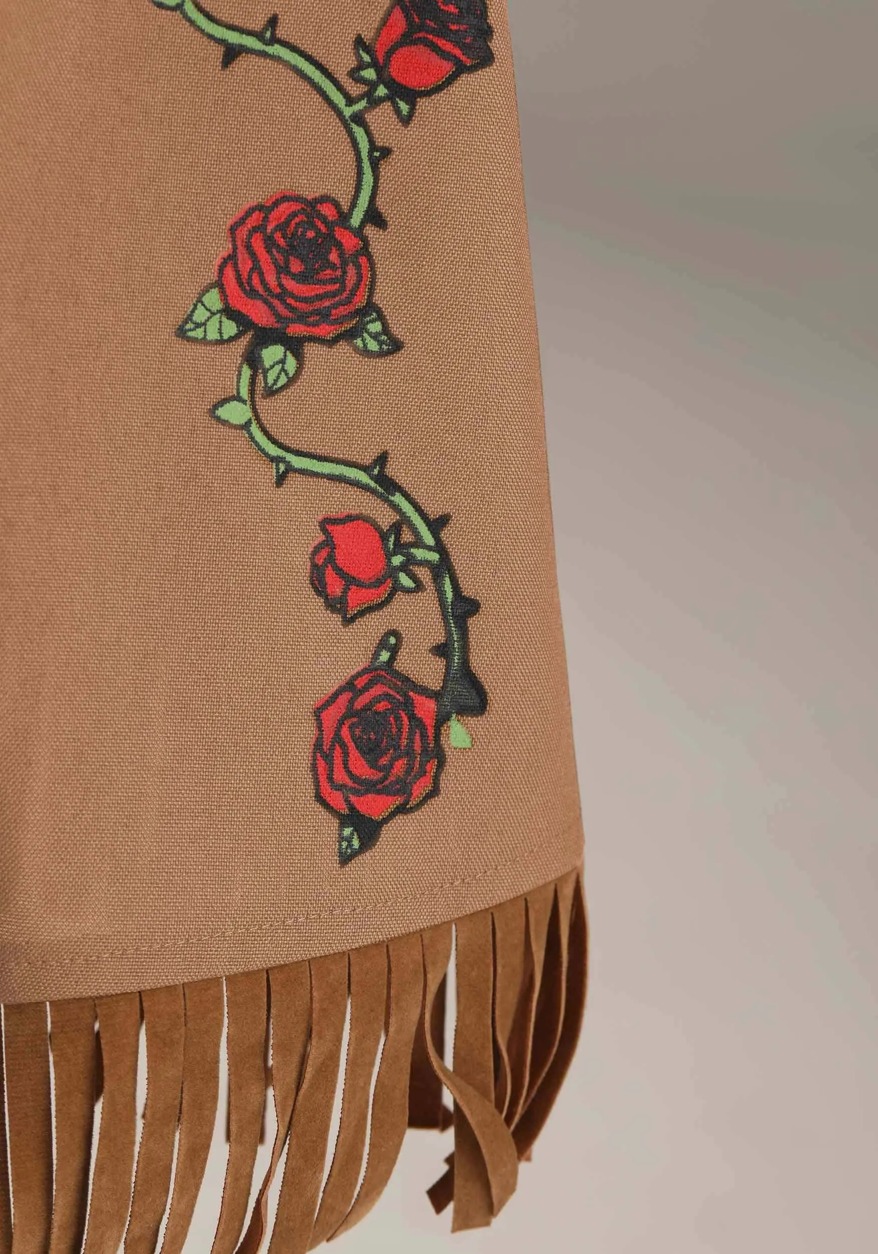 - Floral print on the bodice front, sleeve cuffs, & skirt