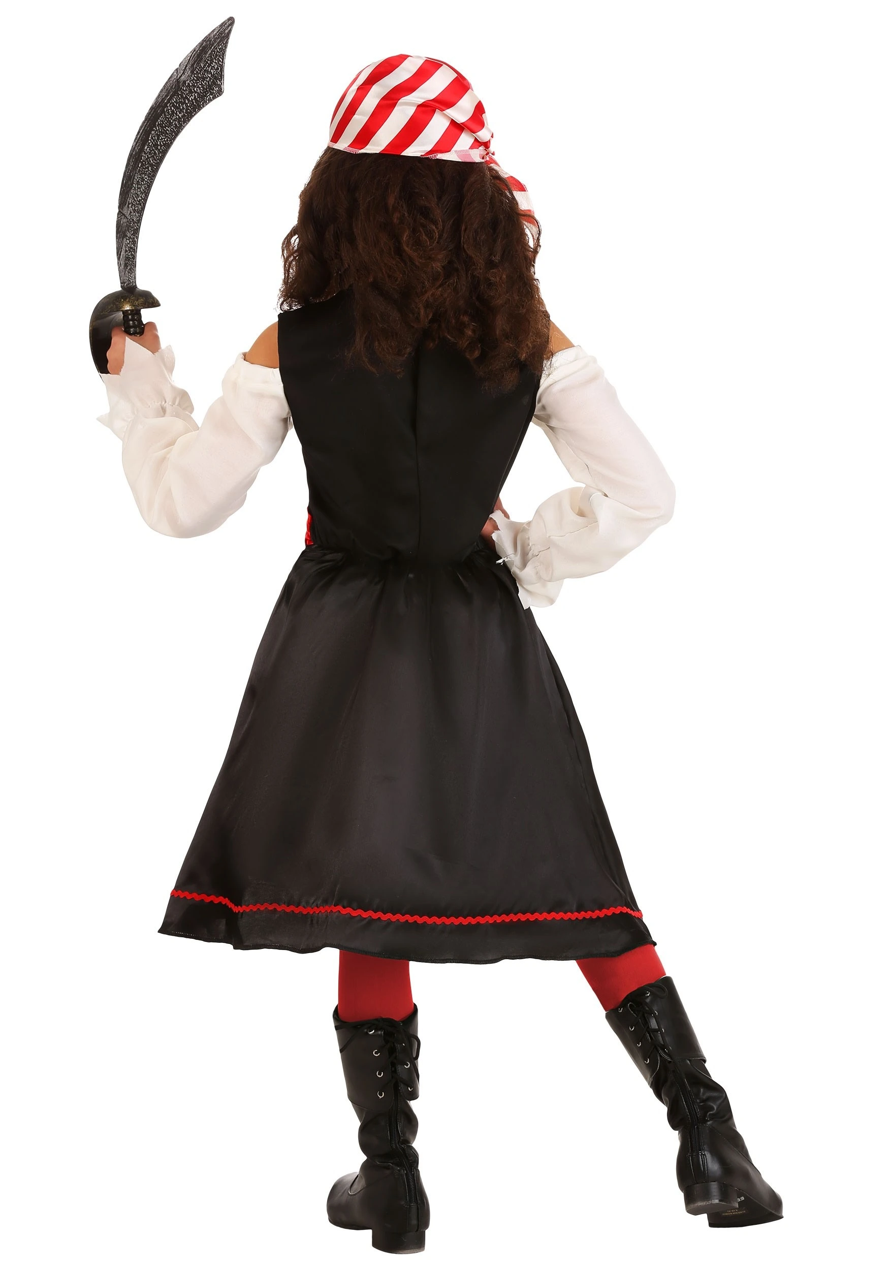 This pirate costume lets your girl have the best of both worlds! It starts with a simple dress, which is a knee-length style with a square neckline. It features red ruffles along the front and a faux belt around the waist. The skirt features a foil Jolly Roger emblem on the skirt, complete with a little red bow on top. The costume also includes a simple headscarf to complete the look! It has a red and white striped pattern and gives your girl a true swashbuckler style.